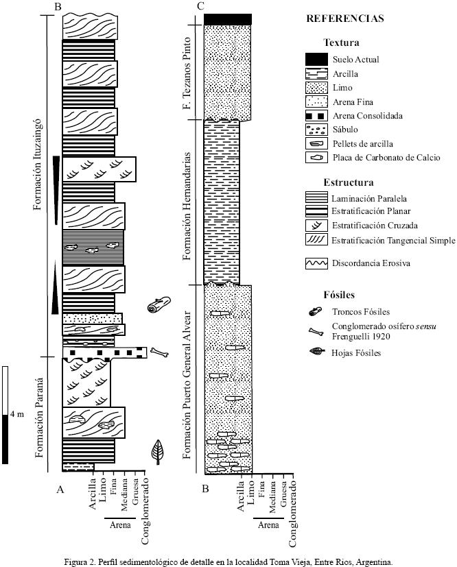 La Formación Ituzaingó está integrada por arenas y areniscas, medianas a gruesas, con diverso grado de compactación, con estratificación planar, tangencial simple y entrecruzada, en la que se intercalan lentes de arcillas de coloración verdosa a grisoscura (De Alba, 1953; Herbst, 1971; Herbst y Santa Cruz, 1985; Jalfin, 1988; Anis et al., 2005). Los ejemplares fósiles provienen de un estrato de arenas medianas, granodecrecientes, con estratificación planar (Figura 2).