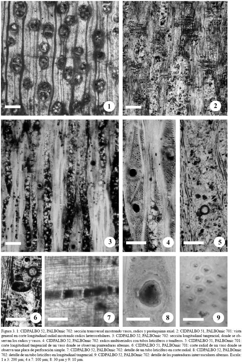 Un carácter diagnóstico de esta familia es la presencia de tubos laticíferos o taníferos. Estos tubos no son canales intercelulares, son largas células laticíferas con pared celular (Tippo, 1938). Este carácter anatómico es común en numerosos géneros de las familias: Apocynaceae, Asclepiadaceae, Campanulaceae, Caricaceae, Euphorbiaceae y Moraceae (Carlquist, 2001; IAWA, 1989). El material se diferencia de la familia Asclepiadaceae por el tipo de seriación en los radios y el tipo de parénquima; de la Campanulaceae en el diámetro de los elementos de vaso y en la presencia de parénquima bien diferenciado; de la familia Caricaceae por presentar fibras y de la familia Euphorbiaceae por el diámetro de los elementos de vaso y por presentar radios de un solo tamaño.