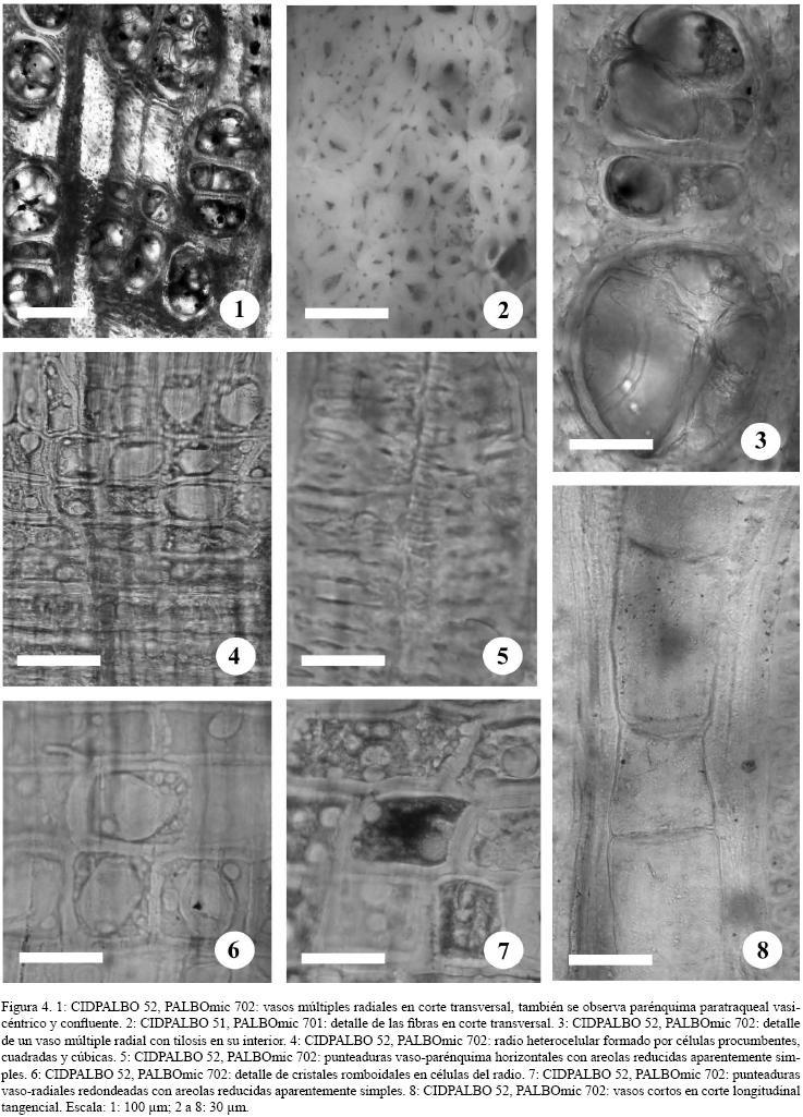 Descripción. En corte transversal los anillos de crecimiento son distinguibles, demarcados por parénquima terminal. La porosidad es difusa (Figura 3.1). Los vasos no presentan ningún patrón de disposición (Figura 3.1). Los poros son de contorno redondeado y sus paredes presentan un grosor de 9 (215) μm; la mayoría de los poros tienen contenidos marrones, negros y ocres oscuros, y presentan abundante tilosis (Figuras 3.1, 4.1 y 4.3). Los poros se presentan predominantemente solitarios (54%), ocasionalmente múltiples radiales y múltiples tangenciales de dos, tres, cuatro y hasta nueve elementos (26%, 12%, 5% y 1% respectivamente) (Figuras 3.1, 4.1 y 4.3). Son de tamaño moderado, con un diámetro radial de 206 (49382) μm y un diámetro tangencial de 136 (49382) Lm. Son numerosos con una densidad de 17 (627) por mm2. Las fibras son muy abundantes, de sección redondeada a poligonal (pentagonal a cuadrangular), no septadas y están comprimidas unas contra otras (Figura 4.2). Tienen paredes gruesas y lumen estrecho, con un diámetro de 13 (520) μm y un espesor de pared de 6 (310) μm. Se observan espacios intercelulares entre las fibras (Figura 4.2). Los radios presentan un trayecto rectilíneo a levemente sinuoso, bordeando algunos vasos (Figura 3.1). El parénquima axial es paratraqueal y apotraqueal. El parénquima paratraqueal es vasicéntrico escaso, completo e incompleto, también se observa algunas bandas de parénquima uniendo dos o más elementos de vaso (de una a 15 células de ancho) (Figuras 3.1 y 4.1). El parénquima apotraqueal es escaso y difuso agregado (Figura 3.1).