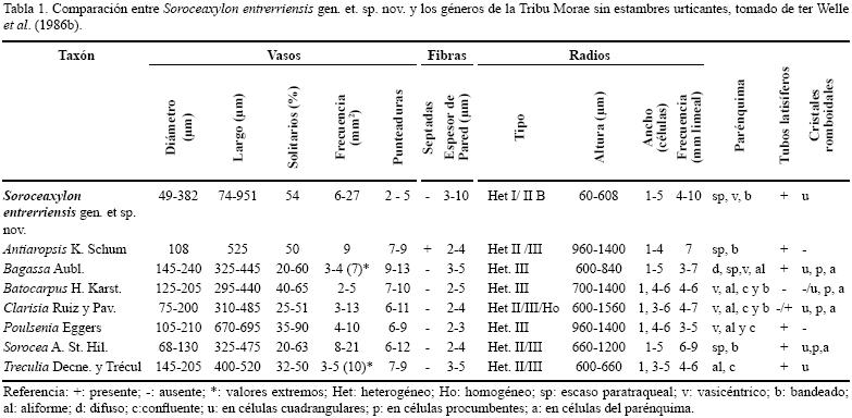 Entre los géneros de la Tribu Morae sin estambres urticantes, el material presenta similitudes con Sorocea A. St. Hil. (Tabla 1). Éste es el género actual más afín al material estudiado y comparte las siguientes características anatómicas: porosidad difusa, diámetro y largo de los vasos, frecuencia por mm2 y de vasos solitarios, tamaño de las punteaduras intervasculares, ausencia de fibras septadas, espesor de la pared de las fibras, tipo de radio, seriación, frecuencia, tipo de parénquima axial, presencia de tubos laticíferos o taníferos y presencia de cristales romboidales en células cuadrangulares de los radios (Record y Hess, 1940; ter Welle et al., 1986b; InsideWood database [2004onwards]).