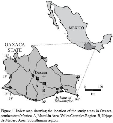 The fossil localities occur within the Matatlán and Nejapa areas in Oaxaca, southeastern Mexico. The Matatlán area lies on the eastern part of the Valles Centrales, some 20 km east of Oaxaca City, between 16°50' 17°00'N and 96°15' 96°30'W. The Nejapa area is set northwest of the Isthmus of Tehuantepec, roughly midway between the cities of Oaxaca and Tehuantepec, between 16°30° 16°40'N and 95°55' 96°10'W (Figure 1).