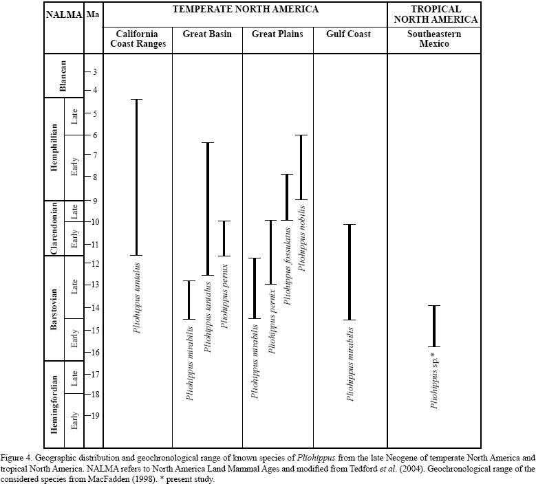 The reconnaissance of Pliohippus sp. from Oaxaca geographically extends southward the Equini record from the TransMexican Volcanic Belt to the Sierra Madre del Sur MP, and establishes equines in a tropical environment. Biogeochronology pushes tribe Equini back in time some six Ma, from the Hemphillian to the late Early Barstovian; this is the oldest known equine record of Mexico (Figure 5).