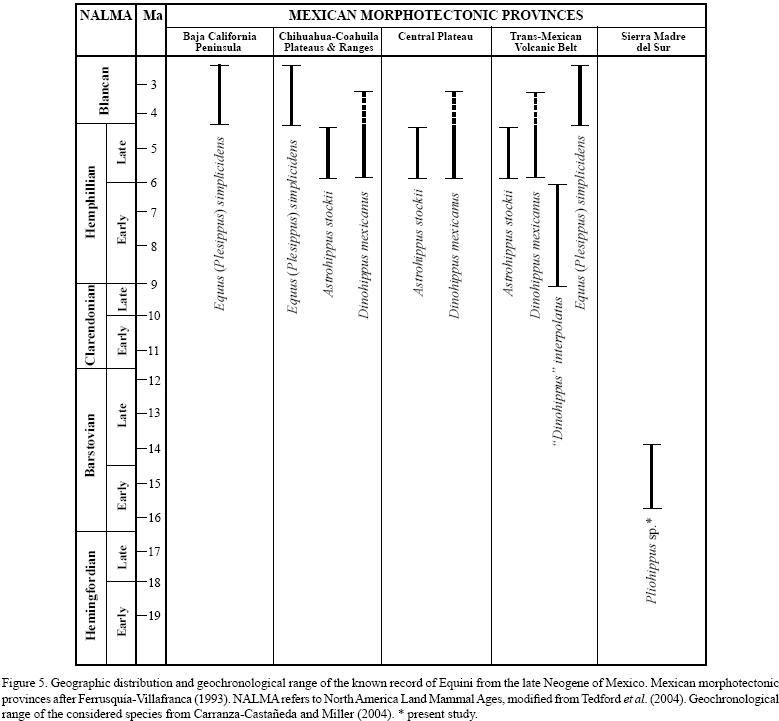 Prior to this report, the Equini from Mexico were known from the Hemphillian and Blancan of several morphotectonic provinces (hitherto MP, FerrusquíaVillafranca, 1993): Astrohippus stockii and Dinohippus mexicanus have been found in the ChihuahuaCoahuila Plateaus and Ranges MP (= CHCO) (Yepómera, Chih., Lance, 1950; Lindsay, 1984; Lindsay et al., 2006; MacFadden, 2006), the Central Plateau MP (= CeP) (San Luis Potosí and Zacatecas, CarranzaCastañeda, 2006), and the TransMexican Volcanic Belt MP (= TMVB) (Jalisco, MontellanoBallesteros, 1997; CarranzaCastañeda et al., 2002; Guanajuato, cf. CarranzaCastañeda, 2006; CarranzaCastañeda and FerrusquíaVillafranca, 1978; CarranzaCastañeda and Miller, 1998). "Dinohippus" interpolatus occurs in the TMVB (Jalisco, Guanajuato and Hidalgo, Miller and CarranzaCastañeda, 1984; CarranzaCastañeda, 2006, reported as Dinohippus interpolatus), and Equus (Plesippus) simplicidens (reported as E. (Dolichohippus) simplicidens) from the Blancan of the CHCO MP, TMVB MP (CarranzaCastañeda, 2006), and the Peninsula de Baja California MP (southern end, Miller, 1980).