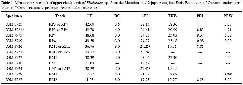Summing up then, the odontography of Oaxacan cheek teeth closely resembles that of Pliohippus; however, the lack of associated cranial material, and the fact that dental features alone are no longer suitable means to establish species identity within this genus, constrains us to assign the studied cheek teeth suite to Pliohippus sp.