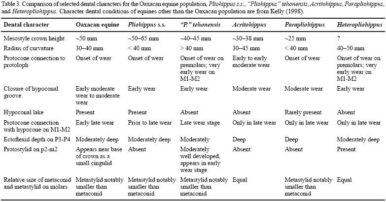 As summarized in Table 3, the Oaxacan cheek teeth differ in several respects from those of other related Middle Miocene horses, including Acritohippus from the Late Hemingfordian of California and Nebraska and the Barstovian of California, Florida, Nebraska, Oregon, Nevada, and Montana; Parapliohippus from the Late Hemingfordian of California; and Heteropliohippus and "Pliohippus " tehonensis, both from the Early Clarendonian of California. The cheek teeth of Acritohippus are distinguished from the Oaxacan cheek teeth by having (a) small mesostyle crown heights (ca. 30 mm), (b) protocones connected to protoloph in early moderate wear, (c) absent hypoconal lake, (d) metaconid and metastylid equal or subequal in size on molars, and (e) ectoflexid that fully penetrates the isthmus on premolars (Table 3). The cheek teeth of Parapliohippus differ from those of the Oaxacan cheek teeth as follows: (a) subhypsodont (CH ca. 25 mm),