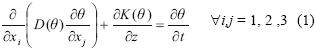 La forma convencional de la ley de Darcy no describe adecuadamente el flujo de agua en la zona no saturada, debido, por un lado, al rápido decrecimiento del valor de la conductividad hidráulica cuando el contenido de agua disminuye y, por otro, a la disminución del área transversal disponible para el flujo de agua en medios no saturados. Puesto que en la zona de estudio resulta patente la presencia de fracturas, es necesario recurrir a un planteamiento en el que se contemple el cálculo de la conductividad hidráulica Para lograr lo anterior, se aplicó la ecuación de Richards (1931), expresando la conductividad hidráulica, K, como una función del contenido de humedad, θ :