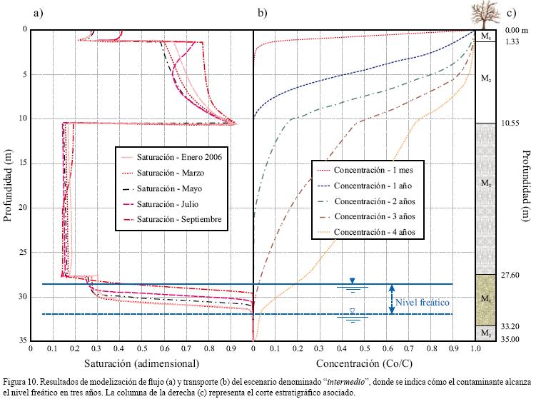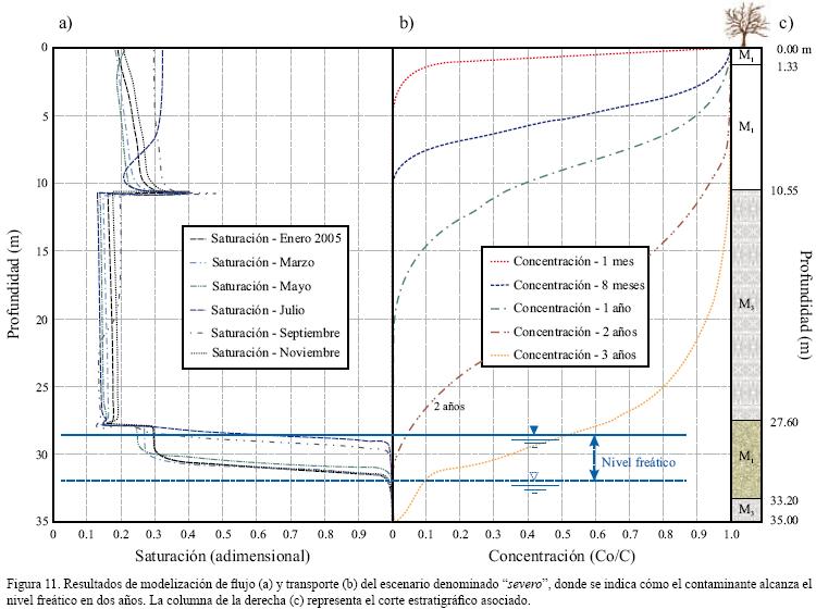 Este último aspecto no debe interpretarse en el sentido de que la cantidad de agua que ha ingresado en el medio es menor. Más bien, el agua es capaz de pasar más rápidamente por estos niveles, impidiendo que la matriz porosa alcance un mayor grado de saturación. Este incremento en la velocidad tiene implicaciones en lo que respecta al transporte de contaminantes, como queda reflejado en las Figuras 10 y 11. En efecto, el análisis comparativo de ambas permite visualizar adecuadamente el diferente comportamiento dinámico del transporte, corroborándose la existencia de una diferencia temporal en el momento de llegada del mismo frente potencialmente contaminante al acuífero subyacente de tres y dos años para los escenarios intermedio y severo respectivamente. A este respecto hay que indicar que las condiciones de simulación para ambos escenarios fueron las mismas, incluyendo los datos de precipitación, evaporación potencial y caudales de descarga de aguas residuales, y solo difieren en los valores de la conductividad hidráulica asignada a los dos primeros estratos.