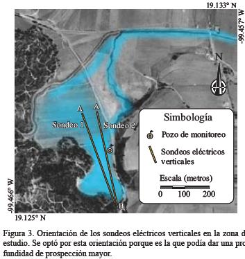 Para determinar el tipo y el espesor de los diferentes niveles que conforman la zona no saturada se realizaron sondeos eléctricos verticales (SEV), cuya localización, orientación y aperturas interelectródicas AB se muestran en la Figura 3.