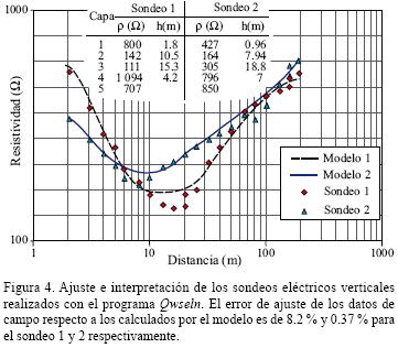 Tanto la localización de los sondeos eléctricos verticales como los resultados de la campaña se muestran en las Figuras 3 y 4. En la primera se presenta la localización, orientación y amplitud interelectródica AB máxima alcanzada en cada ensayo. En la segunda se grafican las curvas experimentales de campo con los correspondientes ajustes a curvas teóricas mediante el empleo del programa Qwseln. Además, se incluye el resultado de la interpretación que en ambos sondeos efectuados coincide con la presencia de cinco capas de desigual resistividad y espesor.
