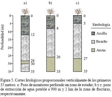 Los materiales descritos coinciden espacialmente con los encontrados en los cortes litológicos de dos pozos de abastecimiento perforados en la localidad de Coatepec, a una distancia de 0.9 y 2 km del pozo de monitoreo de este proyecto (Figura 2d), cuyas columnas estratigráficas se muestran en la Figura 5.