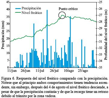 En la misma Figura 6 se incluye, para efectos de comparación, la variación del nivel freático. Es de interés notar que ambos parámetros tienen un comportamiento ascendente antes del 4 de agosto, y que tras esa fecha el nivel freático comienza a descender, aun cuando la precipitación continúa. Además, se puede apreciar un desfasamiento entre los picos de la precipitación y los del nivel freático, producto del tiempo de tránsito a través de la zona vadosa. Puesto que la zona de estudio es una zona de recarga muy cercana al parteaguas del acuífero subyacente, la componente atribuida a la recarga lateral puede considerarse despreciable.