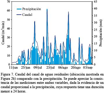 El caudal del canal de aguas residuales que descarga en la zona de fracturas muestra una respuesta inmediata a la precipitación como se puede observar en la Figura 7. El análisis de dicha gráfica indica que, después de una lluvia intensa, el canal drena el agua resultante en ese día y parte del siguiente para regresar posteriormente a su caudal base de alrededor de 3.5 m3/min.