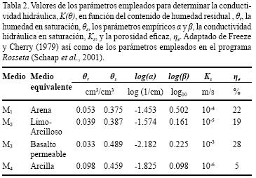 En la Tabla 1 se han incluido las designaciones de los materiales de cada capa considerando a su vez diferentes escenarios en función del desigual grado de fracturación que se puede presentar. En la Tabla 2 se presentan los valores de los parámetros asociados a cada uno de los materiales de la Tabla 1. En la segunda columna de la Tabla 2 se presenta, para efectos de comparación, la correspondencia entre los valores empleados en las simulaciones de este proyecto y aquellos reportados por Freeze y Cherry (1979) así como en el programa informático Rosseta (Schaap, et al., 2001). En la última columna se consignan los valores de porosidad eficaz empleados en este trabajo, mismos que son similares a los reportados por Sanders (1998).