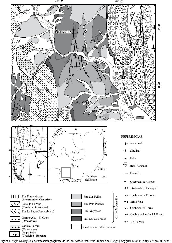 Los depósitos sedimentarios cenozoicos estudiados de la Formación Palo Pintado, se encuentran ubicados en la zona sur del Valle Calchaquí, entre los 25°41'01"S 66°07'55"W y los 25°40'59"S 66°05'49"W, aproximadamente a 200 km al suroeste de la ciudad de Salta, en el norte de Argentina (Figura 1). Estos depósitos forman parte del Grupo Payogastilla (Díaz y Malizzia, 1983) que se encuentra integrado, de base a techo, por las formaciones Los Colorados, Angastaco, Palo Pintado y San Felipe con más de 6000 m de espesor acumulados en la zona de la fosafrontal de la cuenca de antepaís cenozoica (Eoceno MedioPlioceno), como producto de la inversión tectónica de la cuenca de rift del Grupo Salta (CretácicoPaleógeno).
