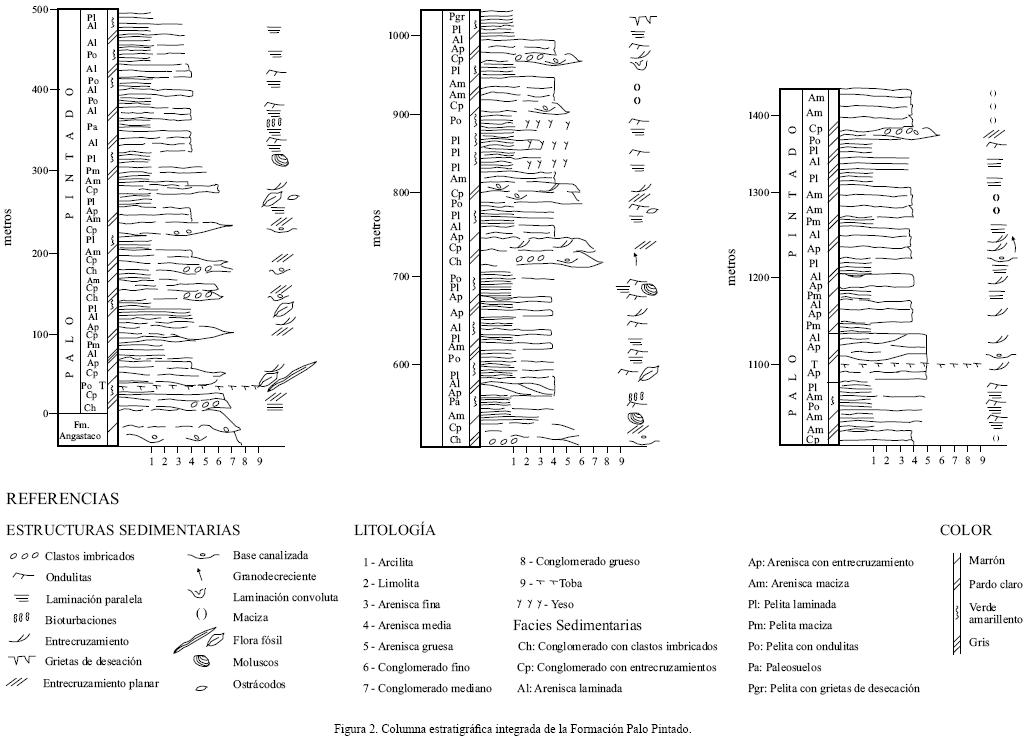 La Formación Palo Pintado se depositó entre los 10.29±0.11 Ma (K/Ar) (Galli et al. 2008) y los 5.27 ± 0.28 Ma (206Pb/238U; Coutand et al., 2006) y está constituida por ciclos grano y estratodecrecientes de conglomerados soportados por matriz, areniscas cuarzosas y sublíticas limpias, medianas a finas, que culminan con niveles de pelitas verdes, que han sido interpretados como sistemas fluviales de ríos anastomosados de baja jerarquía y baja movilidad (Díaz, 1985, 1987; Díaz et al., 1987; Herbst et al., 1987).