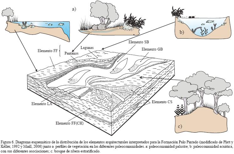 Los subambientes reconocidos con base en el análisis de las litofacies sedimentarias y de la arquitectura fluvial, constituyen los escenarios en los que se habrían desarrollado las paleocomunidades de la Formación Palo Pintado. Estos depósitos presentan litofacies características de un sistema fluvial sinuoso arenogravoso con desarrollo de una amplia llanura de inundación. En este sistema fluvial se identifican depósitos desarrollados dentro del canal o intracanal y de overbank. Las acumulaciones intracanal están conformadas por depósitos de barras gravosas (GB) y formas de lecho (SB) y los depósitos de overbank están representados por barras de acreción lateral (LA); también se destaca la presencia de canales pequeños producto de la erosión en los bordes del canal principal durante eventos de inundación identificados como crevasse channel (CS). La llanura de inundación (FF) es la zona en donde se pueden reconocer las lagunas (litofacies Po y Pl) y pantanos (litofacies Pm y Pgr) que dieron albergue a las comunidades acuáticas y palustres; mientras que si estos depósitos se encuentran asociados a estructuras de desecación y niveles de yeso (litofacies Pgr) con canales abandonados, habrían dado lugar al desarrollo de las sabanas o praderas (FFCH). Las costas de los lagos y pantanos que se entremezclan con cauces fluviales (formas de lecho arenosas SB y depósitos de acreción lateral LA) fueron los lugares donde se desarrolló la comunidad higrófila con bosques de ribera. Las paleocomunidades acuáticas, palustres y los bosques higrófilos fueron estables y persistieron por tiempo prolongado dentro de los cuerpos ácueos o a la vera de ellos y se desarrollaron bajo un clima húmedo tropical a subtropical, como lo indica también el desarrollo de la asociación de minerales de arcillas como illita, esmectita y caolinita acumulados en la llanura de inundación, hecho que no ocurrió antes de los 10 Ma donde imperaban condiciones climáticas más secas.