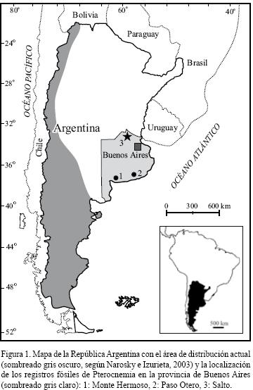 Los restos óseos proceden del Piso/Edad Bonaerense (Pleistoceno Tardío temprano), definido con base en la biozona de Megatherium americanum cuyo estratotipo no ha sido aún especificado (Cione y Tonni, 2001). Fue exhumado en la localidad de Salto (34°17'S 60°14'O) ubicado al norte de la provincia de Buenos Aires (Argentina) (Figura 1). De la misma localidad proviene un ejemplar de gran tamaño asignado a Chloephaga Eyton, 1838 (Anserifomes) (Degrange et al., 2006). Estas aves durante sus migraciones invernales actualmente no sobrepasan la latitud S 37° en la provincia de Buenos Aires (Chloephaga picta excepcionalmente alcanza la costa sur de Uruguay) (Arballo y Cravino, 1999; De La Peña y Rumboll, 1998).