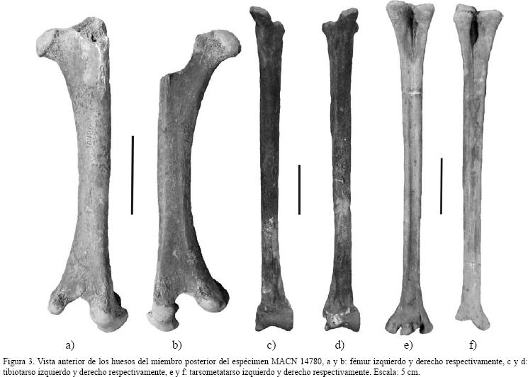 Tarsometatarso: aunque la superficie del MACN 14780 (Figura 6b abajo) conserva el periostio en pocas zonas, se pueden apreciar estriaciones paralelas al eje mayor de la diáfisis. En el ejemplar juvenil actual (Figura 6c abajo), el periostio presenta numerosas estriaciones similares a las del fósil aunque menos marcadas. En el adulto la superficie es lisa con algunas rugosidades dispersas (Figura 6d abajo).