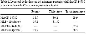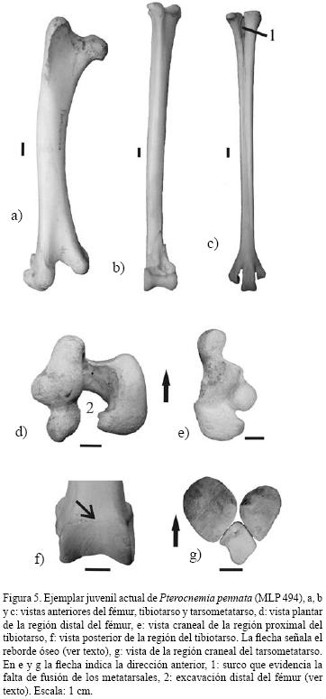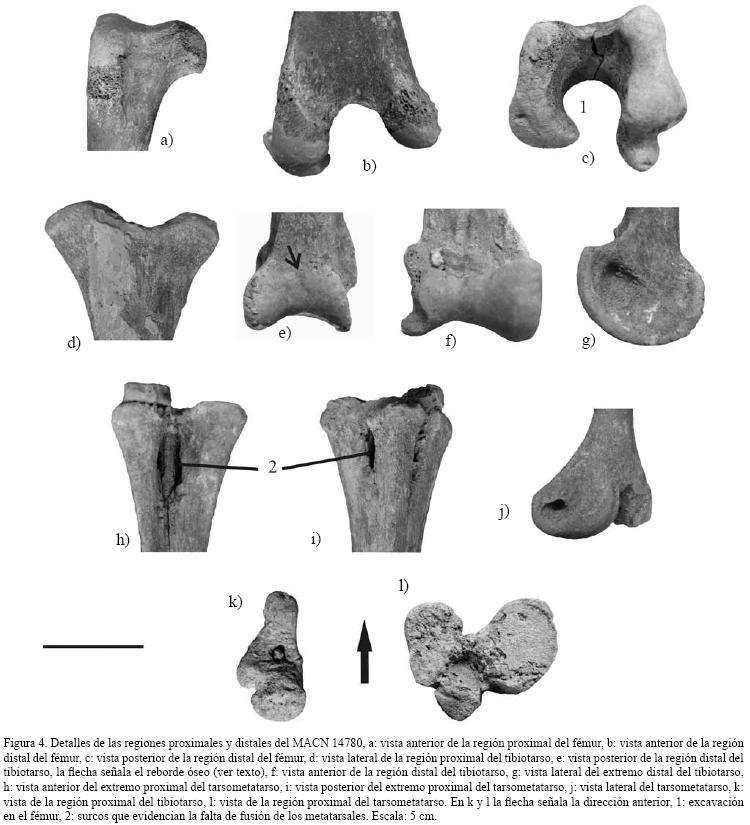 Los huesos fémur, tibiotarso y tarsometatarso (Figura 3), presentan longitudes semejantes a las de un adulto (Tabla 1). El fémur del MACN 14780 (Figura 4a, 4b y 4c) presenta ambos cóndilos separados debido a la ausencia de la región intercondilar y de la fossa poplitea (Figura 4b, 4c). En la región proximal de ambos tibiotarsos faltan las epífisis (Figuras 3 y 4d) y la superficie proximal presenta domos y valles desgastados y redondeados (Figura 3 y 4d). En la región distal (Figura 4e) se puede observar en vista caudal las cristae de la trochlea cartilaginis tibialis unidas por un reborde óseo poco marcado, rasgo propio de la especie (Tonni y Laza, 1980; Tambussi y Tonni, 1985) (ver también Figura 5f). Ambos tarsometatarsos carecen de epífisis proximal (Figura 3), aunque en el tarsometatarso derecho se conserva una pequeña porción de la epífisis (Figura 4h, 4i). El extremo proximal de la diáfisis se caracteriza además por ser ancho y de superficie abultada, pudiéndose notar la falta de fusión de los metatarsales evidenciada por los surcos en la superficie del hueso (Figura 4h, 4i, 4l). En cuanto a la región distal del tarsometatarso, solo se conserva aquella perteneciente al miembro izquierdo en el cual la trochlea metatarsi III está incompleta (Figura 3). Cabe mencionar que el individuo juvenil actual de Pterocnemia pennata utilizado para comparación (MLP 494) (Figura 5) presenta los mismos rasgos descritos para el fósil: fémur con notoria excavación de su extremo distal (Figura 5d), tibiotarso y tarsometatarso sin epífisis (Figura 5 b, 5c, 5e, 5f) y en el extremo proximal del tibiotarso se puede observar los metatarsales sin fusionar (Figura 5c, 5g).