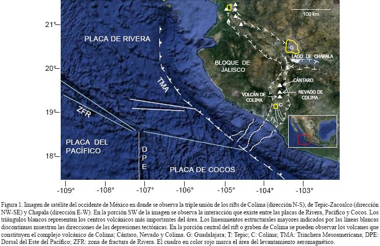 La zona de estudio se ubica en la porción occidental del Cinturón Volcánico Transmexicano, en lo que se conoce como Graben Central de Colima y en la porción sur del rift de Colima (Allan, 1986; Ferrari et al., 2000; Ferrari, 2000). La zona investigada se localiza al sur de la triple unión de los grábenes o rifts de Colima (dirección NS), TepicZacoalco (NWSE) y Chapala (EW). En la imagen de satélite (Figura 1) se puede observar cómo los dos primeros rifts, el de Colima y TepicZacoalco, limitan al E y al N, respectivamente, al bloque de Jalisco, mostrándose las direcciones de los lineamientos estructurales mayores con líneas blancas discontinuas. También se observa en la porción W de México la interacción que existe entre las placas de Rivera, Pacífico y Cocos.