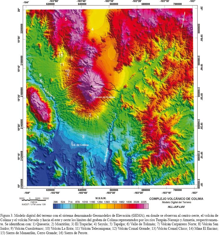 También se construyó un mapa de elevación digital con el sistema denominado Geomodelos de Elevación (GEMA) con datos basados en modelos 1:50,000, con una resolución de 50 m, para el complejo volcánico de Colima, el cual muestra para el Nevado de Colima una estructura volcánica de grandes dimensiones en relación con el Volcán de Colima, se observan grandes zonas de barrancas, así como la zona del volcán paleoFuego del Colima caracterizada por un fragmento de anillo del cráter que aún se puede observar hacia el norte de la estructura volcánica actual (Figura 3).