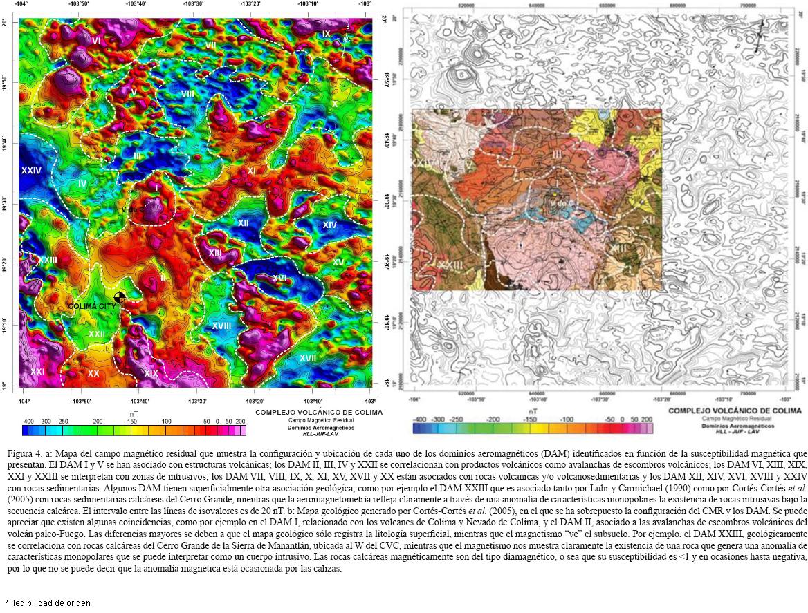 En la Figura 4, se han conjuntado los mapas del CMR, con los DAM y la geología reportada por CortésCortés et al.(2005). Lo primero que se aprecia es que el mapa geológico sólo cubre un área del orden de una tercera parte el estudio aeromagnético. En los mapas se pueden apreciar algunas coincidenciasbentre las unidades litológicas y algunos DAM, como por ejemplo, el DAM I que se correlaciona con los edificios volcánicos del Volcán de Colima y el Nevado, y el DAM II que se asocia a depósitos de avalancha de escombros volcánicos del volcán paleoFuego. Se puede observar en los mapas que algunos de los límites de las unidades litológicas no coinciden con las fronteras de los DAM, y la razón es que el magnetismo no sólo registra la geología superficial, sino que penetra en el subsuelo y puede definir las diferencias en las susceptibilidades magnéticas que definen los DAM.
