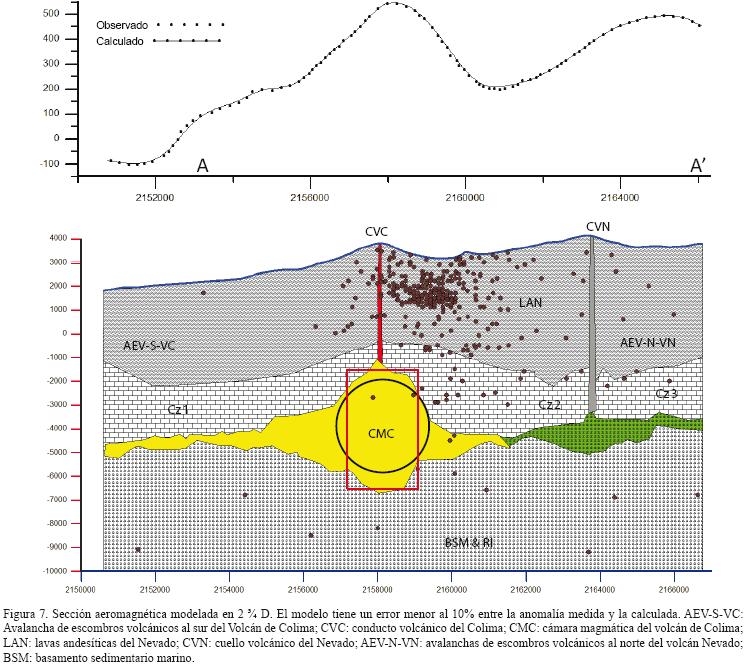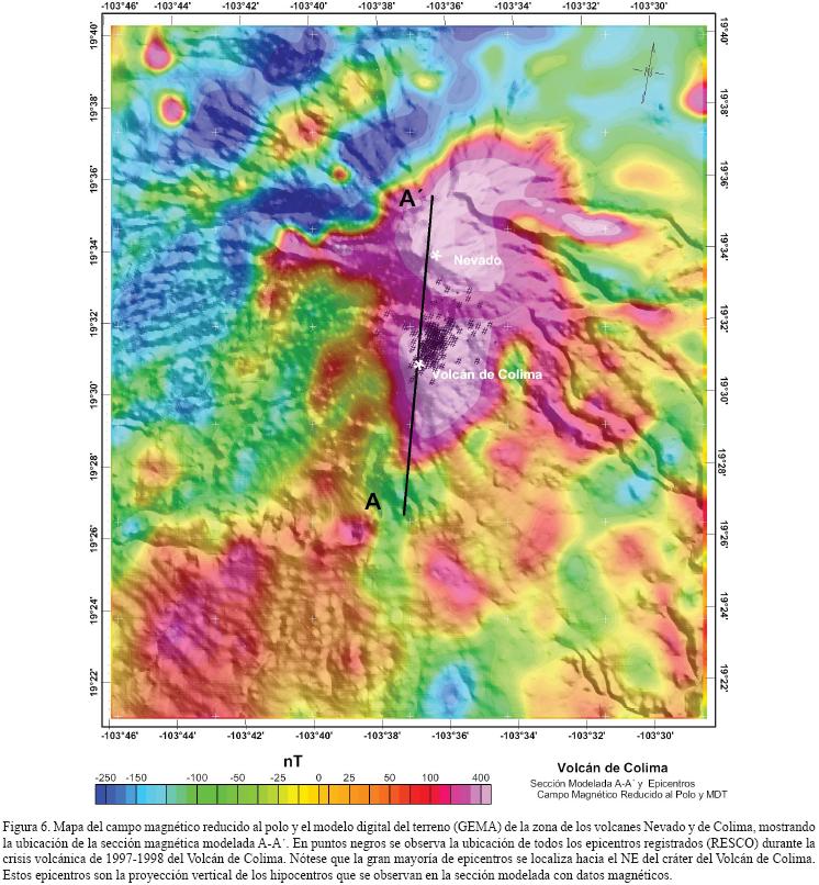 Se reporta la interpretación cualitativa y cuantitativa de anomalías aeromagnéticas del complejo volcánico de Colima (CVC) y sus alrededores. La zona se caracteriza por anomalías magnéticas de distintas amplitudes y longitudes de onda asociadas con estructuras volcánicas y cuerpos intrusivos, incluyendo al CVC. Se identifican 24 dominios aeromagnéticos definidos por patrones característicos de anomalías en un área de aproximadamente 11,500 km2 alrededor del CVC. El Volcán de Colima y el Nevado de Colima se caracterizan por anomalías dipolares de gran amplitud. Se investiga la estructura profunda del complejo volcánico utilizando un modelo magnético dimensional 2¾ D, encontrando que la fuente asociada a las anomalías de los volcanes se relaciona con una posible cámara magmática de forma alargada, con una longitud mayor a los 6.8 km en dirección NS y espesor máximo de 5.6 km. En el Volcán de Colima, ésta se localiza a una profundidad de 4.8 km. Este cuerpo se extiende por una distancia del orden de 5.6 km hacia el sur del CVC con un espesor promedio del orden de 0.54 km. Bajo el volcán Nevado de Colima se interpreta una posible cámara magmática colapsada de forma alargada con una longitud en dirección NS mayor a 5.6 km y con espesor máximo de 1.2 km con una profundidad del orden de los 5.2 km bajo el cráter del Nevado. Se documentan, por primera vez, nuevas estructuras geológicas asociadas a anomalías magnéticas sepultadas por productos volcánicos, comofallas y cuerpos intrusivos. En la mayor parte del mapa magnético reducido al polo, se observan anomalías monopolares de grandes dimensiones, amplitudes altas y longitudes de onda largas, asociadas a rocas intrusivas. A 47 km al NW de los volcanes Colima y Nevado de Colima se puede apreciar un cinturón formado por tres de estas anomalías. En la zona también existe una serie de anomalías magnéticas relacionadas con la presencia de yacimientos de mineral de hierro, como la mina El Encino ubicada a 48 km al SE y el área mineralizada de la Sierra de Manantlán a 42 km al ESE del volcán de Colima.