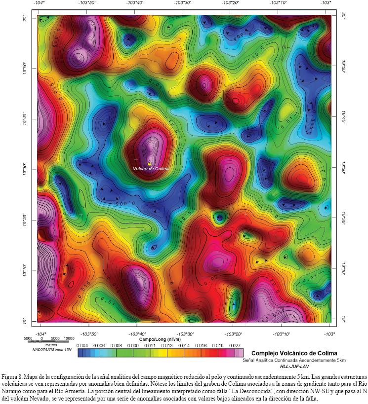 Key words: magnetic anomalies, aeromagnetic modeling, geological mapping, tectonics, Colima volcanic complex, Mexico.