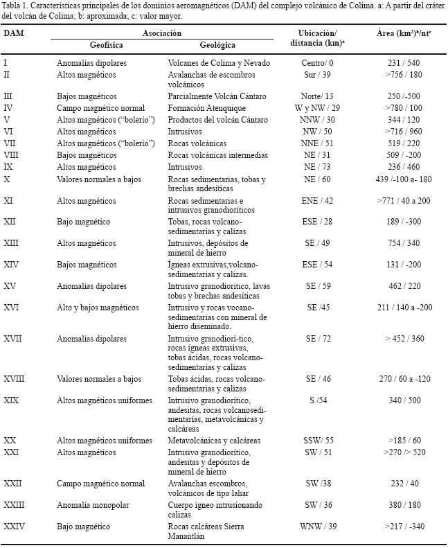 Algunas de las asociaciones geológicas de los DAM fueron tomadas de los trabajos de Luhr y Carmichael (1990) y de CortésCortés et al. (2005), aunque las definiciones de estos autores está basada sólo en la geología superficial (el área que cubren es sólo una porción del estudio aeromagnético) y la definición de los DAM tiene como base los valores de contraste de susceptibilidad magnética que muestran las rocas en la zona. Por ejemplo, en los mapas geológicos de dichos autores, el anticlinal de Cerro Grande, en la Sierra de Manantlán al oeste del Volcán de Colima se marca como calcáreo, porque es la roca que aflora, más sin embargo la aeromagnetometría, refleja la existencia de anomalías magnéticas que se asocian con rocas intrusivas y extrusivas. En estos casos, que son varios en la zona estudiada, la definición que se utiliza en las interpretaciones es la de los DAM.