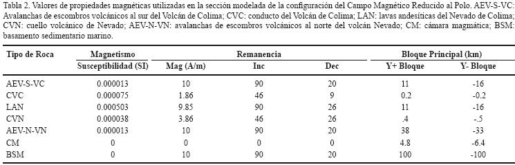 Las lavas andesíticas del Nevado de Colima tienen rangos de susceptibilidad e intensidad de remanencia de 2.5x10510x105 SI (media: 6.2x105 SI) y 0.377.33 A/m (media: 0.56 Am), respectivamente. Muestras de lavas históricas de la pared este de la caldera del Volcán de Colima muestran rangos de susceptibilidad e intensidad de remanencia de 4.2x1059.8x105 (media: 5.8x105 SI) y 0.81.0 A/m (media: 0.88 Am), respectivamente.