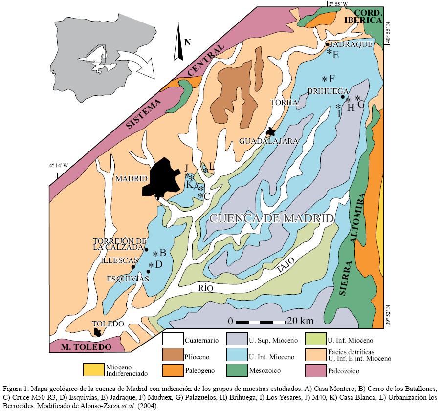 El Mioceno de la cuenca de Madrid se divide en tres unidades tectosedimentarias denominadas Unidad Inferior, Intermedia y Superior (Junco y Calvo, 1983; Hoyos et al., 1985). Los límites entre estas unidades están marcados por discontinuidades sedimentarias importantes, como los paleokarsts situados a techo de la Unidad Intermedia (Cañaveras et al., 1996) e Inferior (RodríguezAranda et al. , 2002), o por cambios en la evolución vertical de los depósitos. Estos últimos se generaron por períodos de reactivación tectónica de los bordes de la cuenca o por cambios climáticos significativos (AlonsoZarza et al., 2004). Los materiales que rellenaron la cuenca durante el Mioceno, se suelen distribuir de forma concéntrica, con los depósitos detríticos gruesos adosados a los bordes, dando paso gradual a depósitos medios, finos y químicos en el centro de la misma. Los medios sedimentarios inferidos a partir de estos depósitos son sistemas fluviales en las márgenes de la cuenca, y charcas y lagos poco profundos en las partes centrales.
