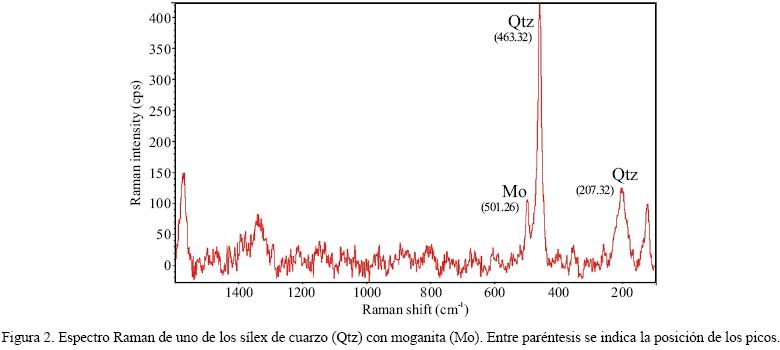 Mediante DRX se determinó que el mineral más frecuente de sílice es el cuarzo, aunque su variabilidad es muy alta, dependiendo de las muestras. Mediante espectrometría Raman se encontró además que el cuarzo está acompañado de pequeñas proporciones de moganita (Figura 2) en aquellas muestras que microscópicamente se habían definido como formadas por mosaicos de cuarzo microcriptocristalino y formas fibrosas (calcedonia) (Bustillo et al. , 2011). No se expresa este mineral en la tabla de composición mineralógica porque cuando se trabaja en DRX, no es diferenciable del cuarzo, a no ser que se realicen refinamientos de Rietveld (Heaney y Post, 1992).