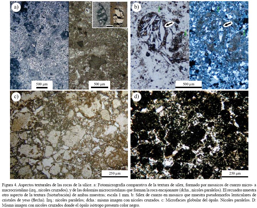 Aunque los sílex están formados mayoritariamente por cuarzo, entre unos niveles y otros, e incluso dentro de un mismo nódulo o nivel, varían las texturas del cuarzo y las impurezas. Tienen tonos grises, blancos, castaños claros y marrones, y son densos y pesados. En microscopía óptica los sílex son incoloros, y con nícoles cruzados se observa que el cuarzo se presenta formando mosaicos de cristales (desde microcriptocristalinos hasta macrocristalinos) (Figura 4a) y por variedades fibrosas, que se clasifican en función de su elongación como: calcedonita normal, calcedonita helicoidal, cuarcina y lutecita (Bustillo, 1976). Los sílex presentan, a su vez, tramas complejas derivadas de las rocas encajonantes, pudiéndose advertir intraclastos, bioturbación (Figura 4a), alguna forma de microfósil y pseudomorfos lenticulares de cristales de yeso (Figura 4b).
