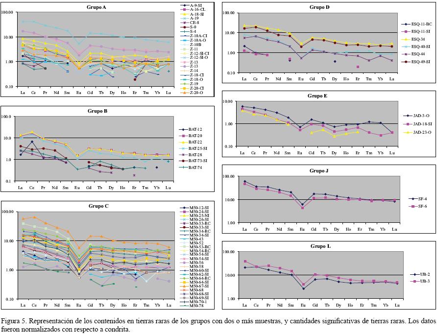 En el Grupo B, el proceso de silicificación se realiza por reemplazamiento de sepiolita y paligorskita (PérezJiménez, 2010), por lo que también se genera el alto coeficiente de correlación negativo entre SiO2 y MgO (0.93). Considerando el K, como representante del grupo de arcillas y terrígenos finos (illitas, esmectitas, micas, etc.), resulta que los elementos asociados con altos coeficientes de correlación (> 0.8) son: Al2O3, Fe2O3, Na2O, TiO2, Ba, Cs, Ga, Hf, Nb, Rb, Sr, Th, Zr, Y, Zn Pb y todas las tierras raras, indicando una cierta diferencia con el grupo anterior en relación al tipo de arcilla y los terrígenos finos del medio sedimentario, ya que aunque muchos elementos son comunes, otros como Fe2O3, Na2O, Ba, Ga, Pb y Zn son nuevos, y no aparecen Ca2O ni P2O5.