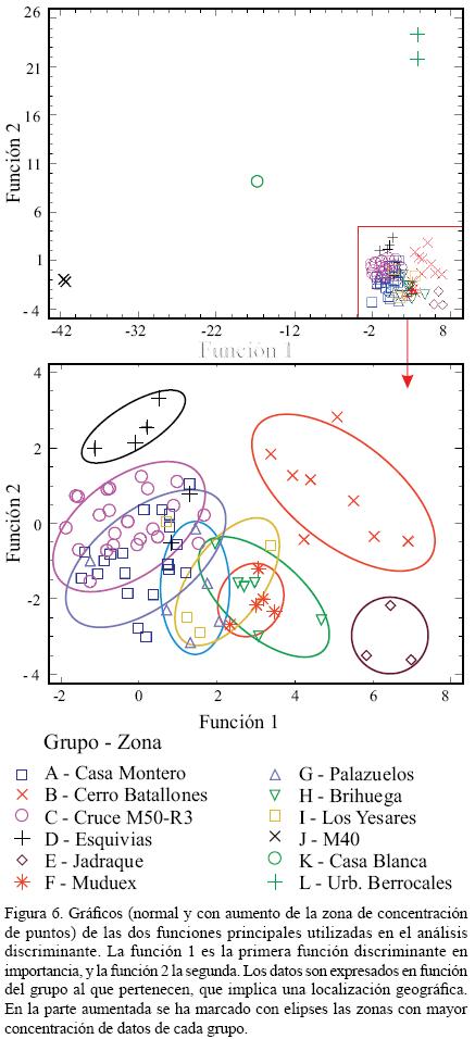 Con la totalidad de las muestras se hizo además un análisis estadístico discriminante, con objeto de valorar si la composición química podría definir una situación geográfica. Este método, al igual que el de análisis de componentes principales, ha sido usado anteriormente en rocas silíceas, para mostrar si se pueden definir formaciones homogéneas como fuentes de suministro (Glascok, 2004; Huckel et al., 2011)