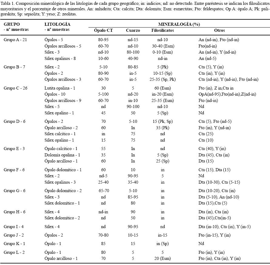 El ópalo es una fase de la sílice que encierra entre 5 y 10% de agua normalmente, y realmente no es un mineral único, ya que utilizando DRX, se distinguen diferentes tipos de ópalo (Jones y Segnit, 1971). En las muestras estudiadas las fases opalinas encontradas fueron, el ópalo A (sílice amorfa) y el ópalo CT (ópalo formado por intercalaciones de cristobalita y tridimita de baja temperatura que coexisten microestructuralmente con zonas amorfas). El ópalo CT es muy abundante, y en contraste, la presencia de ópalo A es escasa. Otros minerales encontrados han sido calcita, dolomita, yeso y arcillas, como componentes habituales, y más escasamente anhidrita, zeolitas y siliciclásticos (feldespatos, circón, micas, etc.). Precisamente todo este conjunto de minerales, diferentes a los de sílice, son los que dan el sello geoquímico a las rocas de sílice.
