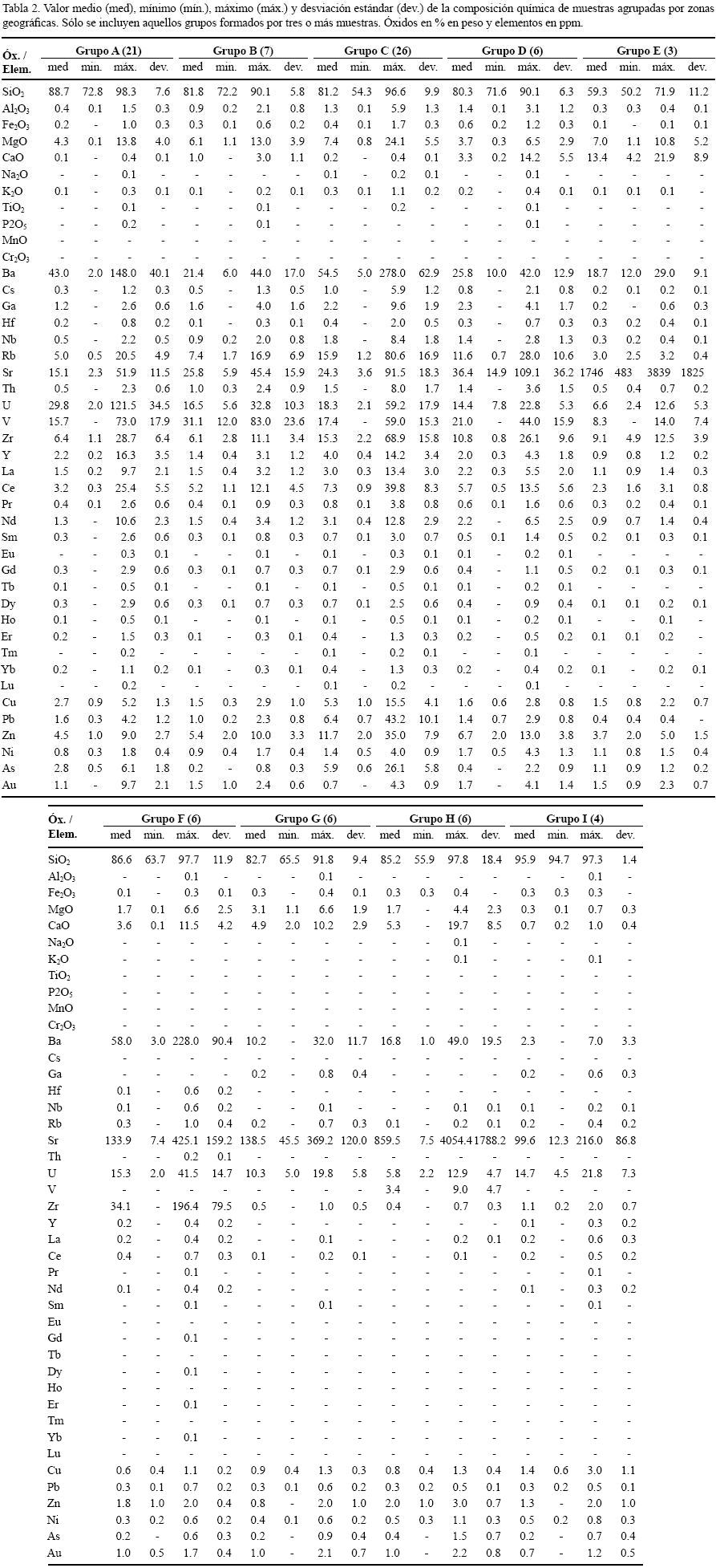 La Tabla 1 expone el número de muestras analizadas por localidad geográfica y su composición mineralógica mayoritaria. Los resultados expresan que la mayoría de las muestras son ópalos, sílex y sílex opalinos, aunque contienen cantidades variables de minerales que corresponden a restos de las rocas encajonantes. Por debajo del 70 % de sílice se considera que la silicificación es parcial y que la roca silícea resultante tiene muchos restos de la roca encajonante, pero aporta datos interesantes a la hora de caracterizar geoquímicamente las zonas. En general, las rocas de sílice presentan concentraciones muy pequeñas de otros elementos diferentes a la sílice, y son fundamentalmente las impurezas correspondientes a la roca encajonante las que sirven para caracterizarlas.