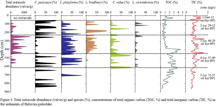 The occurrence and association of ostracodes in a water body are controlled by temperature, salinity, dissolved oxygen content, pH and solute composition of the water as ostracode shells are composed of lowMg calcite (Delorme, 1989). Each ostracode species is tolerant to a range of water salinity (total dissolved solids) and temperature, and their association indicates the variation in hydrochemical characteristics of the water column (Forester, 1986). For example, Candona patzcuaro and Cypridopsis vidua inhabit water bodies that are warm (1332 °C) and have low salinity (1005000 ppm), whereas Limnocythere platyforma inhabits cold (415 °C) and dilute (1001000 ppm) waters. The presence of both Limnocythere bradburyi and Limnocythere ceriotuberosa indicates water bodies having a wide variation in temperature (432 °C). However, Limnocythere bradburyi (1000100000 ppm) inhabits more saline waters compared to Limnocythere ceriotuberosa (50010000 ppm; Delorme, 1989). Based on the ostracode association in the five different zones, we infer the water salinity and temperature of Babícora paleolake over the last ca. 72 cal kyr BP, and we support those interpretations with the concentrations of TIC and TOC (see below).