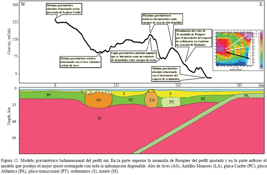 El perfil norte (Figura 9) corta las anomalías positivas de las placas Caribe y Atlántica, secciona perpendicularmente la anomalía correspondiente a la trinchera oceánica de Puerto Rico y las porciones norteñas del alto de Aves y las Antillas Menores en las cercanías de la isla Monserrat.