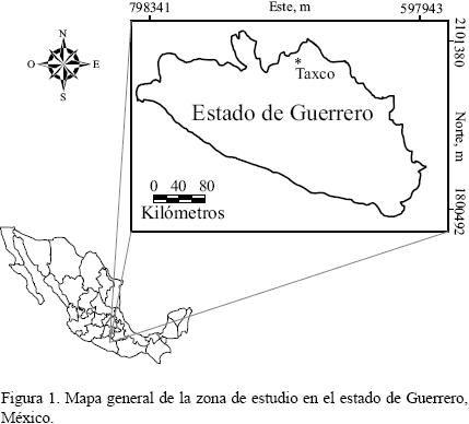 El estudio se efectuó en el área de Taxco de Alarcón que se encuentra en la región norte del estado de Guerrero (Figura 1). Se localiza en la Provincia de la Sierra Madre del Sur, subprovincia 67 en la Depresión del Balsas, con un sistema de topoformas de sierras con cañadas. Debido a la fisiografía del municipio, se presenta una variedad de climas que van desde cálido hasta templado subhúmedo con lluvias en verano (Acw0) según la clasificación climática de Kóeppen. En la zona de estudio, la época de lluvias abarca los meses de junio a octubre, con una precipitación máxima en septiembre de 275 mm, mientras que en la época de secas la precipitación promedio es de 21.2 mm en el mes de febrero (de Cserna y Fries, 1981; Romero et al., 2007).