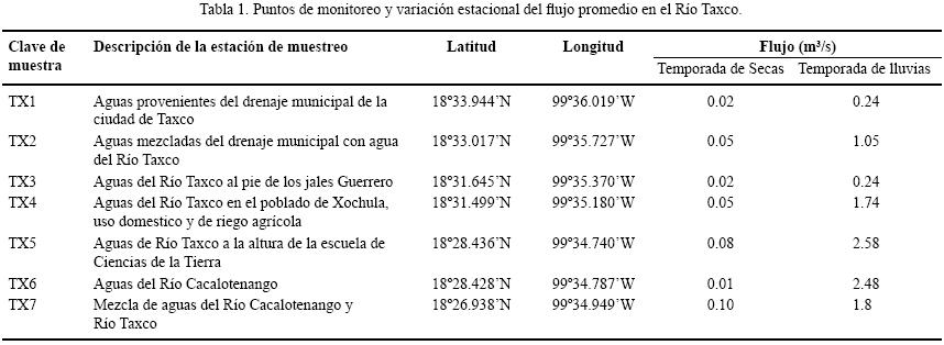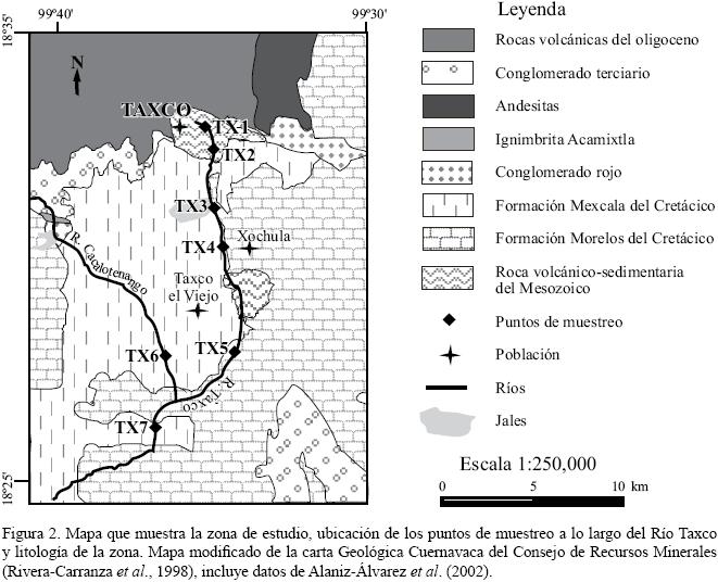 Se ubicaron siete puntos de muestreo sobre el Río Taxco y sus afluentes elegidos en sitios donde se intersectan con el cauce principal y uno más a la salida de la ciudad (Figura 2, Tabla 1), de tal forma que fueran representativos de la problemática de contaminación por metales pesados; uno de estos puntos se encuentra a un lado de la pila de jales y otro de ellos pertenece al afluente del río Cacalotenango en el cual han sido reportadas altas concentraciones de plomo (Romero et al., 2007; ArcegaCabrera et al., 2009).