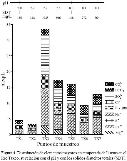Con base en los resultados obtenidos, en las Figuras 3 y 4, se puede observar que tanto en temporada de secas como de lluvias los principales aniones son los bicarbonatos y sulfates, mientras que los cationes se encuentran representados principalmente por calcio seguido de sodio y magnesio. Sin embargo, de acuerdo a los SDT (sólidos disueltos totales) y a los flujos que se presentan en la Tabla 1, se puede observar que durante la temporada de secas el contenido de sólidos disueltos es mayor y el flujo menor en comparación con la temporada de lluvias en todo el transecto estudiado (Figura 3, Tabla 1); TX2 presentó un flujo de apenas 0.05 m3/s en temporada de secas, con una concentración de SDT de hasta 7 veces más que en época de lluvia, debido al aumento del caudal durante esta temporada (128 mg/L de SDT con un flujo promedio de 1.05 m3/s) (Tabla 1, Figuras 3 y 4). El flujo promedio en temporada de lluvia en TX3 ubicado en un afluente del Río Taxco es de 0.24 m3/s, mayor que en temporada de secas (0.02 m3/s), esta corriente al unirse con el Río Taxco en TX4 cuyo flujo promedio es mayor (1.74 m3/s y 0.05 m3/s en temporada de lluvias y secas respectivamente) permite la dilución de los protones y de sólidos disueltos, así como de los metales (Tabla 2, Figuras 3 y 4).