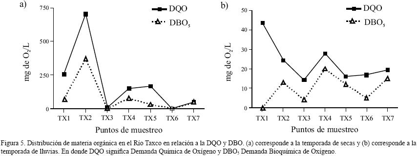 Para evaluar la cantidad de materia orgánica presente en el Río Taxco, se determinaron la DBO5 de acuerdo a la norma mexicana NMXAA028SCFI2001 (SE, 2001a) y la DQO conforme a la norma NMXAA030SCFI2001 (SE, 2001b) por medio del método de reflujo abierto con dicromato de potasio; el Carbono orgánico Total (COT) se cuantificó en un equipo TekmarDohrmann modelo 9000 con un detector de infrarrojo no dispersivo con una curva de calibración de ftalato de hidrógeno de potasio de 5, 10, 15, 20, 25, 30, 40, 60, 100, 150 y 200 ppm y modo TCIC 1400 ppm.