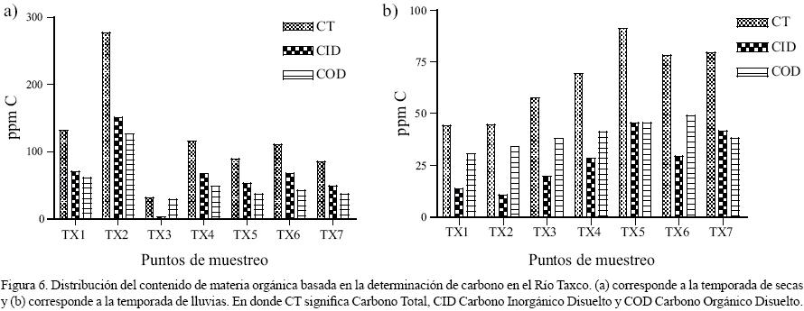 La concentración de materia orgánica disuelta (MOD) en aguas naturales comúnmente se mide como carbono orgánico disuelto (COD); las sustancia húmicas (SH) son los principales componentes de la MOD ya que constituyen de un 40 a 60 % del COD en ambientes acuáticos (Drever, 1988; Adriano, 1992; Senesi, 1993). Los resultados de DQO y DBO5 reflejaron aportes de materia orgánica en las dos campañas muestreadas, con valores que corresponden en temporada de lluvias, según la clasificación de la Comisión Nacional del Agua (2008), a agua altamente contaminada para TX1 y TX2 (DQO >200) y contaminada para TX4 y TX5 (DQO entre 40 y 200) (Figura 5a y 5b). La influencia de las aguas residuales y de las calizas se refleja en las concentraciones de carbono orgánico e inorgánico con valores máximos en TX1 (CT= 131.9 ppm C) y TX2 (CT= 277.2 ppm C) en la época de secas (Figura 6a y 6b) debido al aporte de materia orgánica de las aguas crudas municipales de TX1, aunado a la disolución de caliza que incrementa la concentración de bicarbonatos aguas abajo (Figuras 3 y 4).