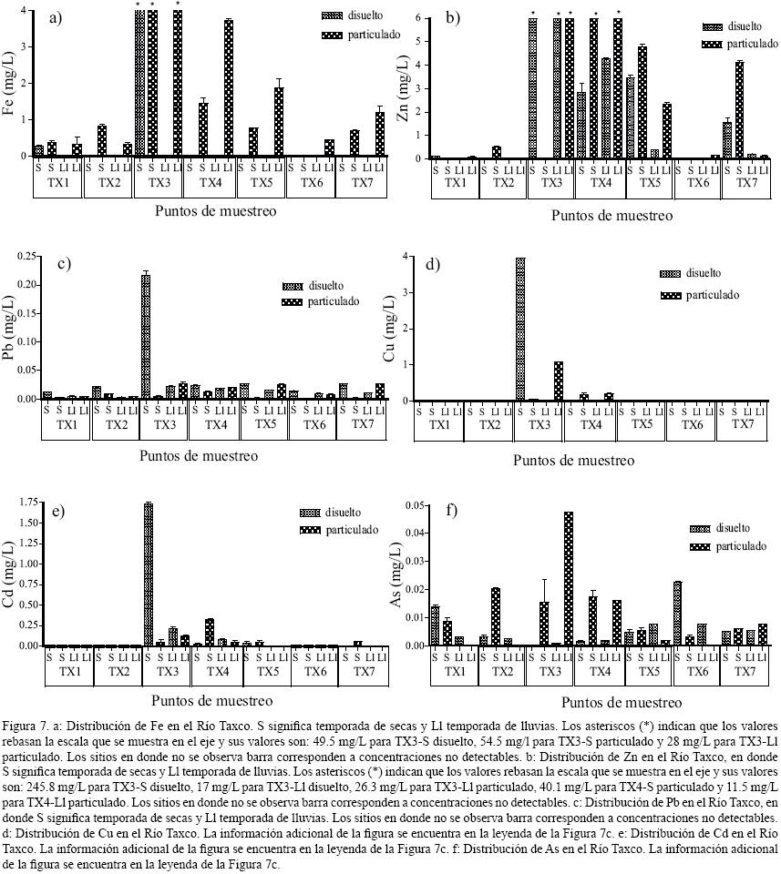 Tanto en temporada de secas como de lluvia, TX6 rebasa los LMP para Pb, debido al arrastre de material particulado proveniente de los jales "La Concha" y "El Fraile" que se encuentran gradiente arriba, los cuales contienen altas concentraciones de Pb y minerales como la plumbojarosita y anglesita (Romero et al., 2007; ArcegaCabrera et al., 2009). Sin embargo, el Río Cacalotenango presentó un flujo promedio (0.01 m3/s) que permite la sedimentación de sólidos como lo reporta ArcegaCabrera et al., (2009) evitando la entrada de estas partículas al Río Taxco, como se observa en TX7 (Figura 7c) donde se encontraron concentraciones similares al sitio TX5 (0.03 mg/L) situado sobre el Río Taxco aguas arriba de la confluencia con el Río Cacalotenango (Tabla 2).