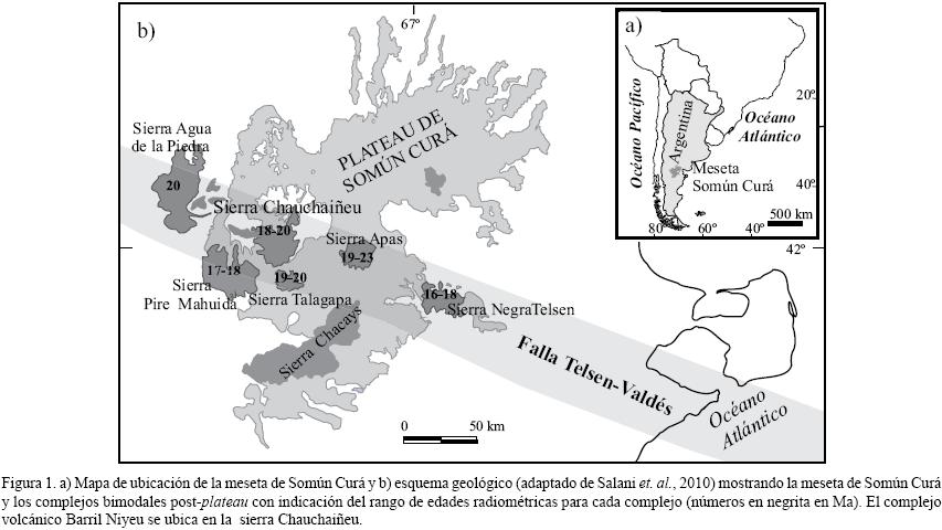 En el sector extraandino norte de la Patagonia argentina (Figura 1a), la meseta de Somún Curá expone un campo volcánico principalmente basáltico construido durante el Oligoceno, que generó un plateau subcircular de bordes irregulares en el norte con espesores maximos de 100 metros. En el Mioceno temprano una segunda etapa post plateau, está integrada por numerosos centros volcánicos de dos tipos: a) monogenéticos basálticos y de escaso desarrollo, reunidos en la unidad Corona Chico (Franchi et al., 2001), y b) núcleos bimodales de composición basaltotraquita/riolita de mayores dimensiones que conforman sierras (p. ej. Sierra de Apas, Agua de la Piedra, Talagapa, Chauchaiñeu, etc.). Estos últimos forman la Superunidad Quiñelaf (Franchi et al., 2001). El Complejo Volcánico Barril Niyeu (CVBN) se destaca como uno de los centros más extensos del evento eruptivo postplateau en el oeste de la meseta de Somún Curá.