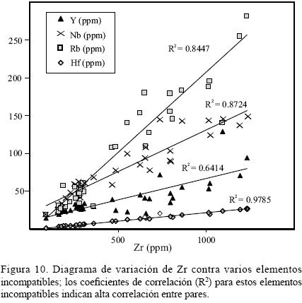 Se identifican correlaciones positivas, en el conjunto de la serie entre elementos incompatibles (Ta, Nb, Hf, Zr, Rb, Y, Th, U, Ga, REE, Figura 10). El Sr, Ba y Eu muestran acumulación en el tramo de las rocas básicas y disminución hacia los términos diferenciados (Figuras 6a y 6b), respondiendo a la cristalización de feldespatos. En los distintos grupos de basaltos la anomalía de Eu está poco desarrollada (Eu/Eu*=0.971.1). Los elementos traza compatibles (Figura 11) reflejan el fraccionamiento de minerales máficos; tendencias de empobrecimiento significativas se identifican para Sc, V, Cr (augita) y Ni (olivino). Este comportamiento sería argumento a favor de un origen comagmático de la serie basalto alcalino a traquita. Las relaciones Nb/Zr para basaltos (0.14 y 0.23) y para traquitas y riolitas (0.11 y 0.18), y las relaciones Nb/Th para los basaltos (14.089.57) y para las traquitas y riolitas (7.114.63) marcan la posibilidad que estén vinculados a una misma fuente a pesar del gap composicional entre 52 y 67% SiO2. Dos muestras de basaltos con evidencias petrográficas de asimilación, tienen porcentajes de sílice que las ubican dentro del gap y presentan valores anómalos de la relación que sugieren procesos de contaminación (con valores de 3.88 y 7.41 respectivamente).