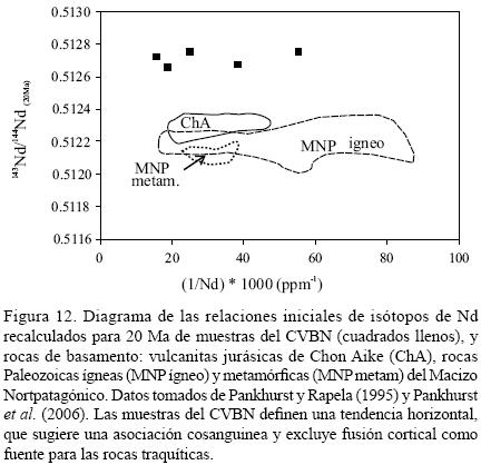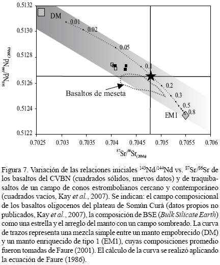 Las relaciones isotópicas iniciales de estroncio (87Sr/86Sr)20Ma varían entre 0.704085 y 0.704761 y las correspondientes a (143Nd/144Nd)20Ma entre 0.512705 y 0.512733 (Tabla 3), con valores de εNd20Ma levemente enriquecidos (0.8 2.4). La firma isotópica de los basaltos del CVBN es menos radiogénica que la de los basaltos de plateau (Figura 7).