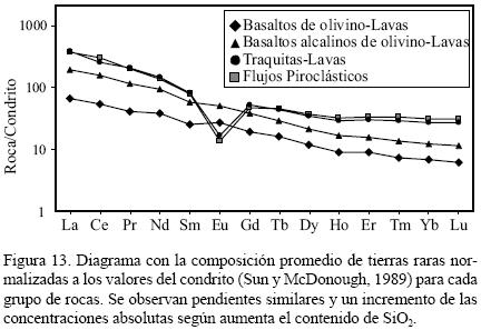 Las relaciones 143Nd/144Nd vs. 1/Nd+1000 (ppm) (Figura 12) definen una tendencia horizontal para las muestras del CVBN. Este comportamiento sugiere una asociación consanguínea que excluye a las rocas de la corteza superior como fuente en la evolución de la serie basaltotraquita del CVBN. Los patrones de elementos de las Tierras Raras (rare earth elements, REE) (Figura 13) son paralelos con variaciones en las concentraciones absolutas, más altas en los grupos de las rocas diferenciadas. La anomalía negativa en Eu en traquitas (Eu/Eu*= 0.1220.579) y riolitas (Eu/ Eu*= 0.0870.373) es distintiva y se asocia con el fraccionamiento de feldespatos.