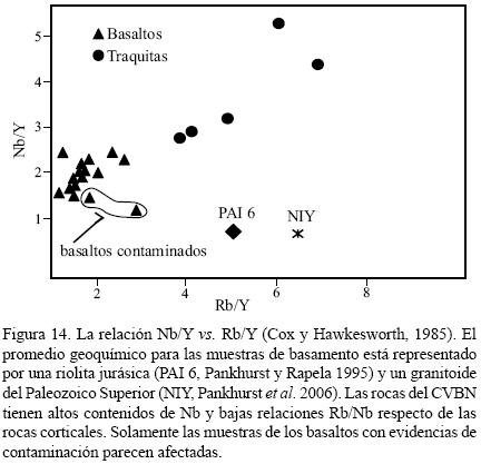 El modelado geoquímico de elementos mayoritarios y traza (Nb/Y vs. Rb/Y y Nd vs. 1/Nd), así como las relaciones isotópicas 87Sr/86Sr y 143Nd/144Nd, permiten excluir procesos de asimilación cortical significativos en la evolución basaltotraquita (Figura 14 y 12). La naturaleza restítica de la corteza nordpatagónica sustancialmente empobrecida en la fracción de baja temperatura por el proceso de fusión cortical masiva de finales del Jurásico, apoya esta evidencia.